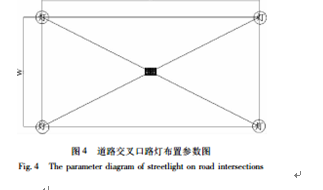 道路交叉口路灯布置参数如图 4 所示。选取最不利区域,道路中心线与路灯间距中线的交叉区域相关照度如下