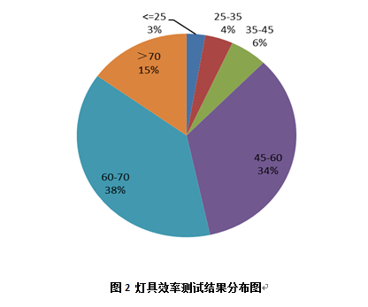 因此,灯具效率是在保证照明质量基础上,有效降低照明安装功率,实现照明节能的重要影响因素之一。实验室对各送检灯具效率进行检测,检测结果显示仅有15%的送检灯具效率符合《城市道路照明设计标准》CJJ 45关于灯具效率不应小于70%的规定,有近50%的灯具效率小于60%,甚至有3%的被检灯具效率小于25%,具体检测结果数据如图2所示。