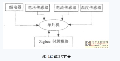 LED路灯监控器的心脏是单片机,它负责数据的处理,是监控器的数据中心。电压、电流、温度传感器采集电流、电压、温度值,继电器则控制LED路灯的状态,然后将信息输送到单片机,单片机和Zigbee射频模块通信,向子网控制器报送LED路灯的各类参数,接受子网控制器的监控命令。