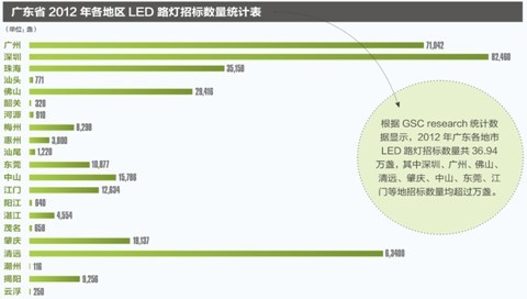 GSC research统计数据指出,2012年广东各地市LED路灯招标数量共36.94万盏,其中深圳、广州、佛山、清远、肇庆、中山、东莞、江门等地招标数量均超过万盏。