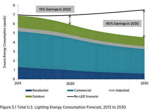 报告显示,预计2020年,LED照明将有助于减少照明能源消耗达15%,而在2030年,照明能源消耗将减少40%(261亿度),以目前的电价换算相当于节省了260亿美元,足够2400万户美国家庭供电。
