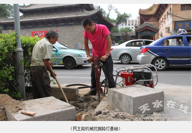 目前,施工人员已拆除解放路、大同路、羲皇大道等路段旧路灯及灯具27套,浇筑路灯基座8处,工程正在紧张、有序进行。